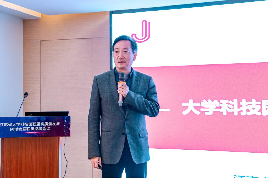 12月17日下午,江苏省大学科技园联盟高质量发展研讨会暨联盟换届会议在南京召开。东南大学党委常委、副校长黄大卫,江苏省科技厅高新处处长李子阳,省教育厅科学技术与产业处二级调研员俞向东,省高新技术创业服务中心主任、党委书记李太生等领导出席了会议。会上,我校大学科技园总经理殷宝良当选江苏省大学科技园联盟理事长,并发表主旨演讲。