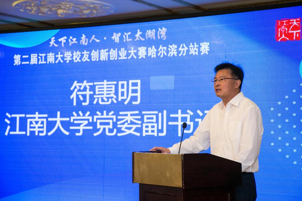 最后,符惠明在大赛闭幕式上致辞。他首先对东三省校友会为本次分站赛的成功举办所做的贡献表示感谢。他指出,东三省的校友会自成立以来,勇毅笃行,蓬勃发展,涌现了一些杰出校友和一批有为青年校友创业企业,为东三省的经济发展和母校校地合作做出了突出贡献。他强调,希望通过此次校友创新创业大赛,进一步拓宽东三省校友创业的“路子”,扩大东三省校友创业的“朋友圈”,合力打造“城市+母校+校友”的校友经济发展共同体,不断推动校友与母校同心同向,共创共赢。