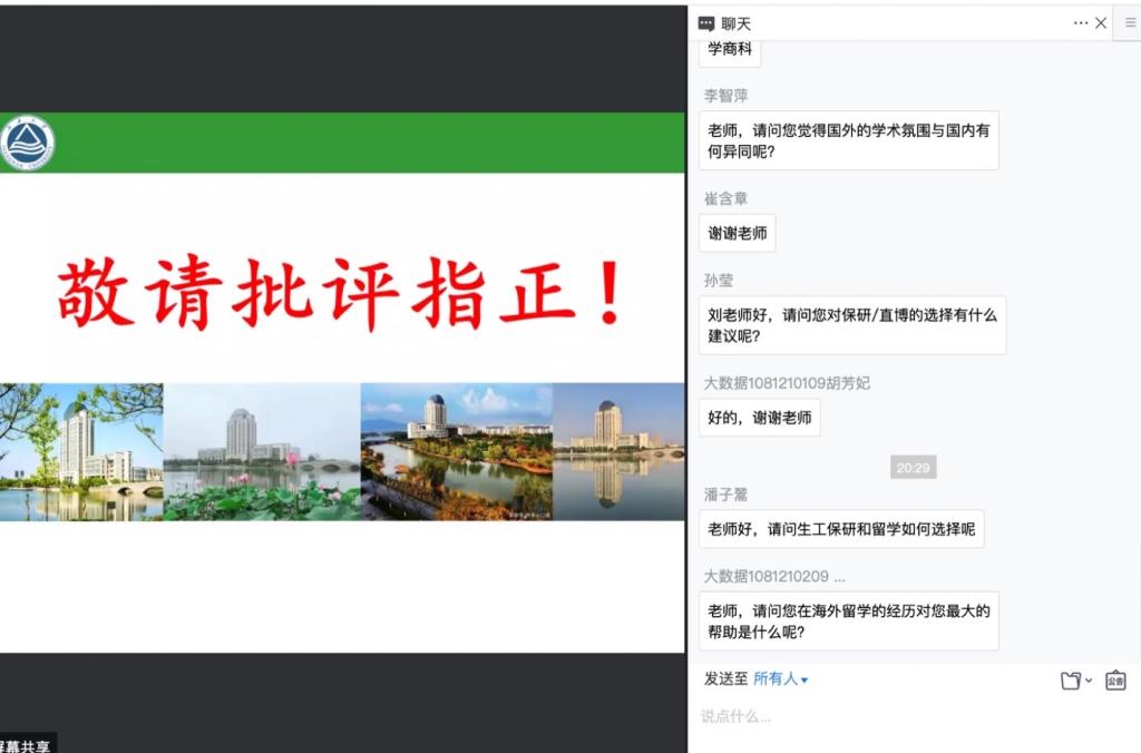 在互动环节中,同学们积极提问,刘立明结合自身经验和体会解答了同学们在保研、留学、科研等方面的问题,他包容、谦逊的态度让同学们顿感亲切,真诚详尽的回答也让同学们收益匪浅。