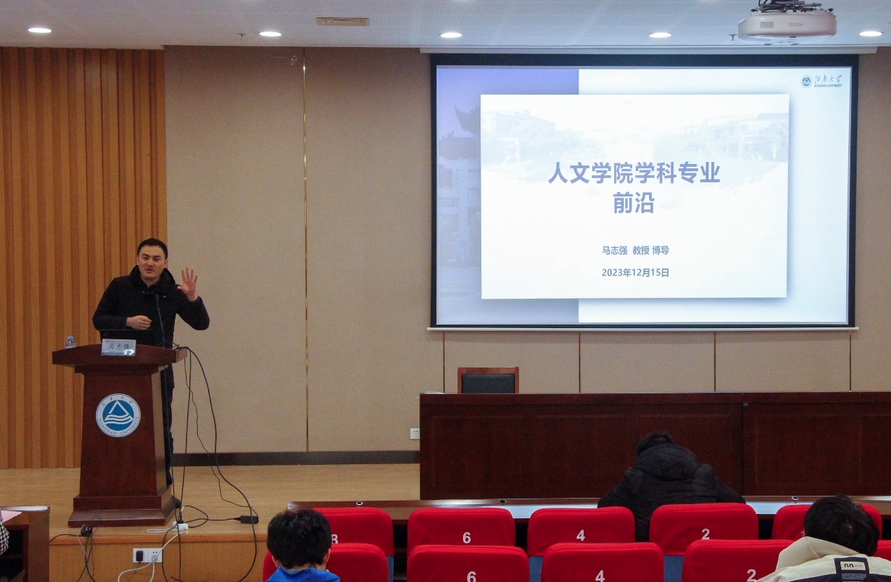 马志强以幽默的方式介绍了人文学院的特点,他比喻人文学院更关注内心的需求与关怀,是一套“内功心法”,与工科学院的“霸道功法”有所不同。人文学院注重发挥教育、中文、艺术三大学科的交叉集群优势,以“文理艺通融,教研做合一”为人才培养特色,探索不同学科差异性中的可能性。他强调了人工智能在教育中的应用和人机协作的未来教育新样态,探索“古文字”中隐藏的诗意密码和文字在历史文化中的重要作用,以及舞蹈动作中蕴含的美和欣赏美的重要性。马志强鼓励同学们积极与人文学院的老师同学交流合作,内外兼修,实现美好未来。马志强的介绍使同学们对人文学院的内核有了更加深入的了解,同时也激发了大家对人文学院的热情和兴趣。