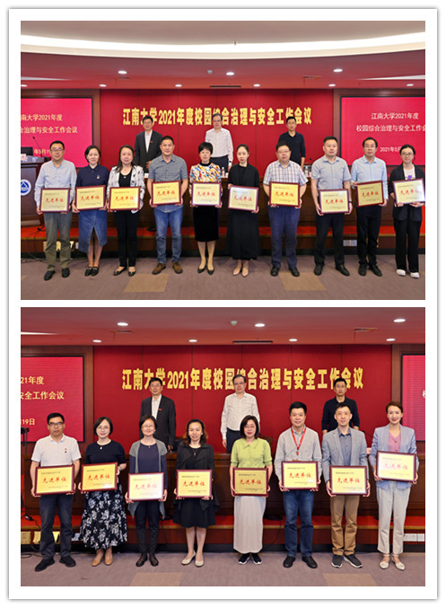 戴月波宣读了《关于表彰2020年度安全生产工作先进单位、先进个人的决定》,并对获奖的20个先进单位、51个先进个人进行了表彰。物联网工程学院党委书记程捷音、食品科学与技术国家重点实验室常务副主任吴敬、实验室与设备管理处副处长赵爱军分别结合工作实际作了大会交流。保卫处处长卢长征以“夯实责任 提高防范确保校园稳定”为题作了2021年校园综合治理与安全主要工作解读。食品学院、商学院、学生工作处(部)作为二级单位代表,与校党政领导签订了2021年《消防安全目标管理责任书》《安全生产与综合治理目标管理责任书》《网络信息安全责任书》。