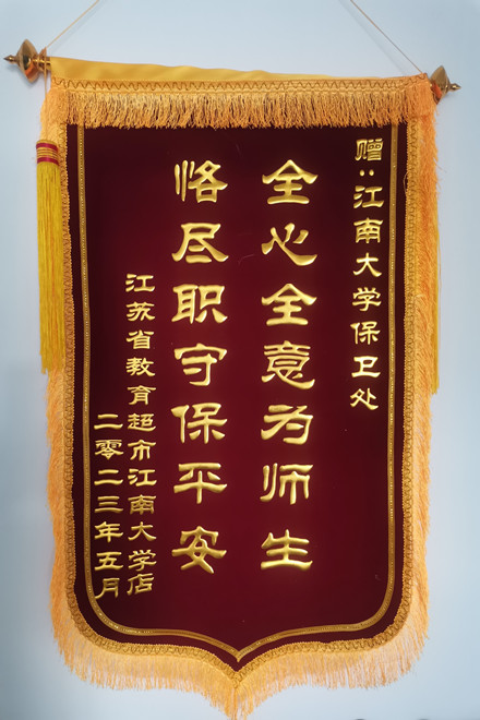 5月22日,北区商业街江苏省教育超市江南大学店的吕先生把一面写有“全心全意为师生 恪尽职守保平安”的锦旗送到保卫部(处),对校园秩序科在解决超市货品丢失事件中提供的一系列尽职服务表示感谢。这是保卫部(处)本学期收到的第二面锦旗。