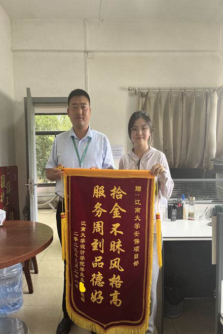 9月28日,设计学院2023级本科新生朱同学将一面写有“拾金不昧风格高,服务周到品德好”的锦旗和一封感谢信送至我校安保人员值班室,对党委保卫部(处)安保队伍的暖心之举表示感谢。