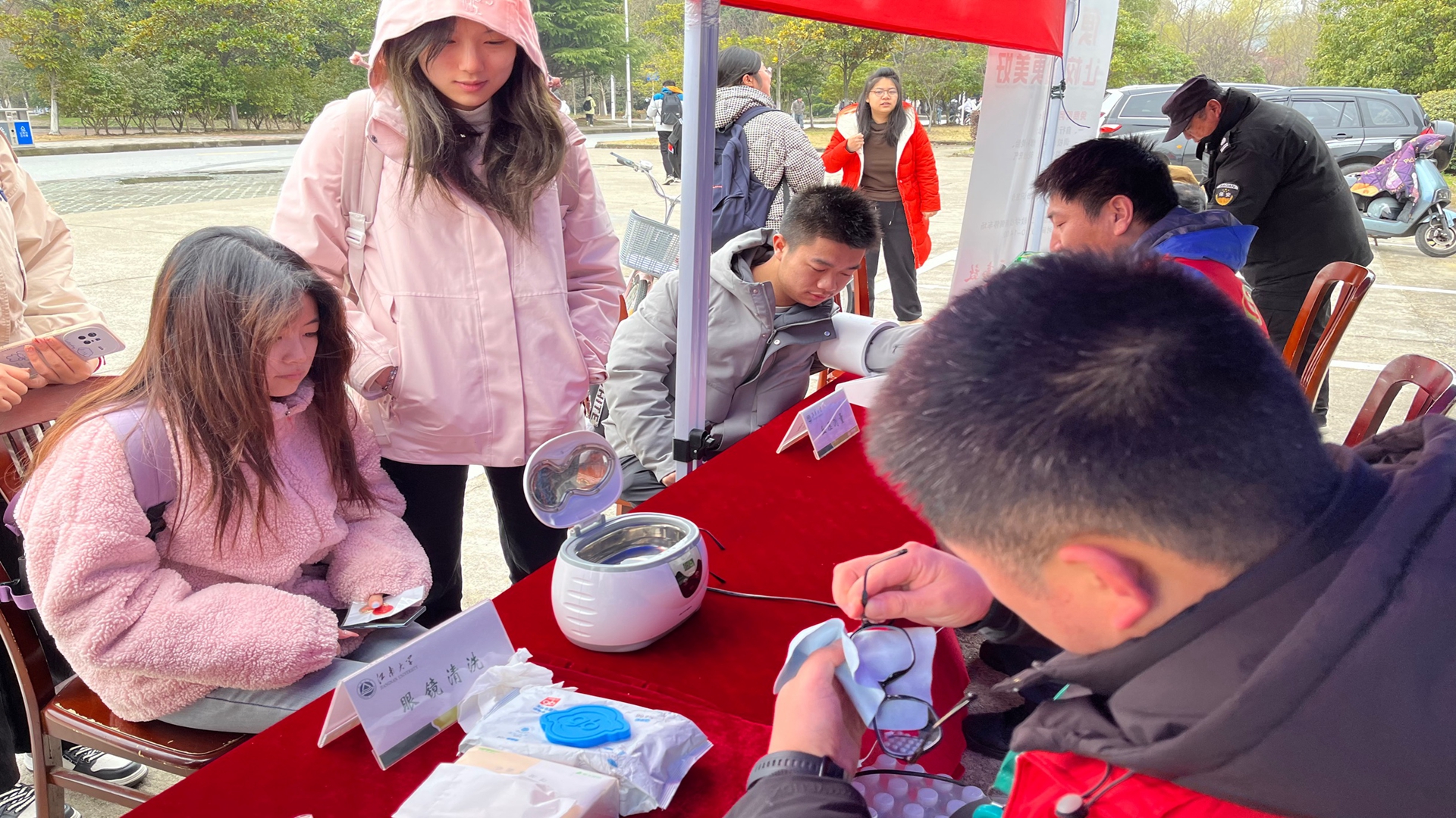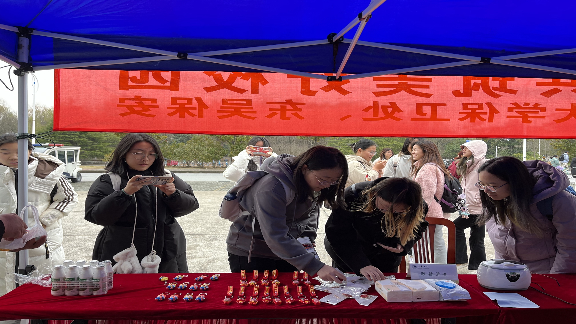 上午10点,活动正式开始,活动摊位前很快就挤满了人头。志愿者热情向师生提供服务、宣传安全知识、解疑答惑。眼镜清洗项目最受师生欢迎,大家纷纷表示眼镜清洗后洁净如新。为加强互动,活动还准备了钥匙扣、书签、娃哈哈饮品等小礼品,深受大家喜爱。