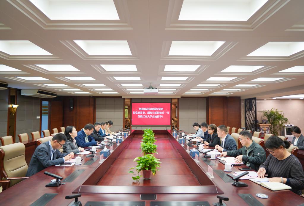 4月12日,泉州师范学院党委常委、副校长夏侯建兵率学校教师工作部、人事处、科技处等部门及学院领导一行来校调研。校党委常委、副校长张影陆接待来访嘉宾,教师工作部、人事处、科研院、社科处、继续教育学院负责人参加座谈。座谈会由教师工作部部长张海峰主持。