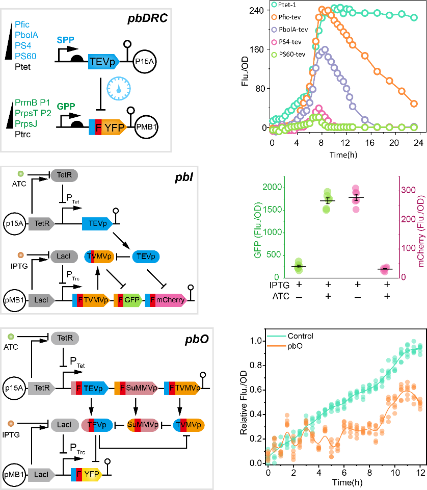在这项研究中,他们将三种具有正交性的病毒蛋白酶和大肠杆菌内源性蛋白质降解机器巧妙结合,构建出两种具有良好可调性和特异性的蛋白质丰度调控单元,并首次在工业模式微生物中构建出三种蛋白酶为基础的新型分子开关:动态开关pbDRC、逆变器pbI和振荡器pbO(图1)。