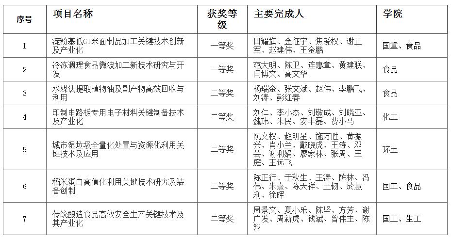获奖项目中,食品科学与技术国家重点实验室田耀旗教授领衔的成果“淀粉基低GI米面制品加工关键技术创新及产业化”和食品学院范大明教授领衔的成果“冷冻调理食品微波加工新技术研究与开发”获技术发明一等奖。