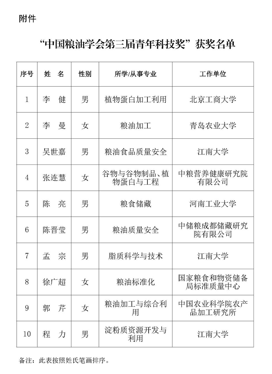 中国粮油学会青年科技奖由中国粮油学会主办,旨在促进粮油青年科技工作者健康发展,提升粮油行业未来人才竞争力,造就粮油领域青年科技英才,是粮油行业重要青年人才奖项。截至目前已成功举办三届,每届获奖人员不超过10人。