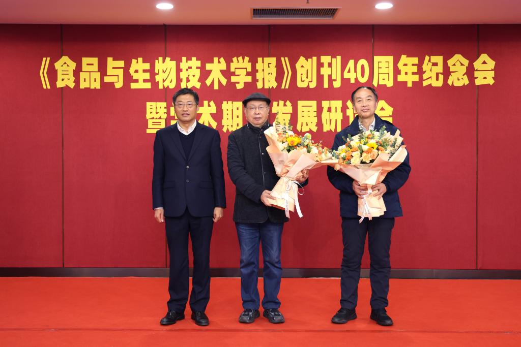 陈卫发表讲话,肯定了学报取得的成绩,感恩历届主编、编辑的辛勤付出。他指出,要进一步提高对期刊工作重要性的认识,并对做好期刊工作提出了四点要求:一是要把牢政治方向,构建学术研究高地;二是要聚焦重点问题,服务学校发展大局;三是要追求创新发展,增强学术引领能力;四是要提升管理能力,不断提高办刊水平。他要求全校6本期刊深入贯彻党的二十大精神,紧密围绕国家重大战略部署,把握好时代机遇,努力实现一流大学建设与一流学术期刊建设的同频共振,着力打造具有江南特质的高品质学术期刊。陈卫代表学校广大师生向曾任学报主编的原校长陶文沂教授、原副校长金征宇教授送上鲜花,表达感谢。大会还举行了《食品生物技术学报》编辑部编审戴陵江、朱明的荣休仪式。陈卫为两位荣休同志送上鲜花,并颁发荣休纪念牌。