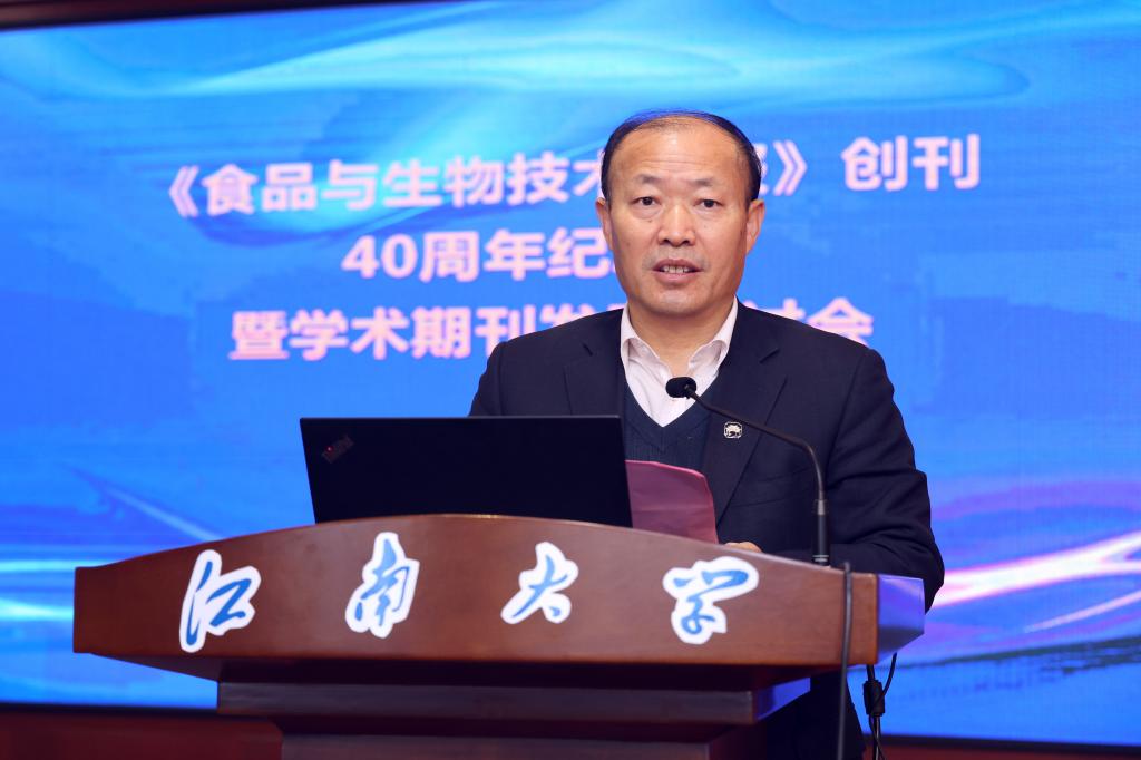12月7日上午,学校在图书馆5楼报告厅举行《食品与生物技术学报》创刊40周年纪念会暨学术期刊发展研讨会。会议邀请了江苏省委宣传部出版处、中国高校科技期刊研究会、中国科学院文献情报中心、中国科学技术信息研究所信息资源中心、江苏省期刊协会的领导和专家线上参会。学校相关职能部门领导及相关学院(实验室)教师代表、学报历届主编和编委、全校期刊编辑部成员线下参会。江南大学校长陈卫,校党委常委、副校长顾正彪出席会议。