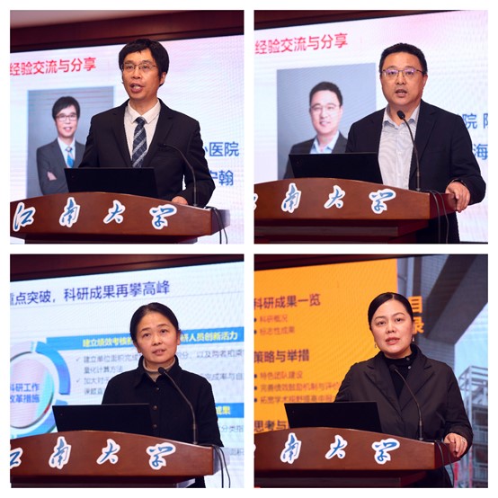 交流环节,附属中心医院院长冯宁翰从医院学科发展、人才高地建设、未来科研目标等方面分享经验体会,并表示将通过学校平台持续推动高水平临床型、研究型医院的建设。纺织科学与工程学院院长付少海从科研方向布局、军工体系打造、团队与平台建设、标志性成果培育这四个方面分享了纺织学院在科研工作中的经验做法。国家重点实验室常务副主任吴敬围绕科研成果突破、测试服务能力、国重优化重组工作等方面作了经验分享。设计学院院长魏洁从标志性成果产出、特色团队建设、绩效机制规范等三个方面对学院的工作进行了交流汇报。