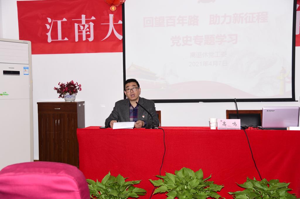 今年是中国共产党成立100周年,为了更好地总结历史经验、认识历史规律、掌握历史主动,4月7日上午,在离退休人员活动中心一楼大会议室,离退休党工委、离退休工作处邀请到无锡市中共党史学会副会长、校特邀党建组织员、马克思主义学院关工委常务副主任高鸣老师作“回望百年路,助力新征程——中国共产党是引领中华民族伟大复兴的核心力量”党史专题学习培训会。退休老领导、党工委委员、党支部、关工委、老科协、老体协等骨干、共建支部无锡市精神卫生中心离退休支部委员及离退休工作党支部全体党员近百人参加了学习培训会。会议由许南惠主持。