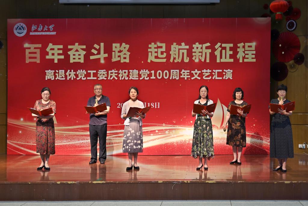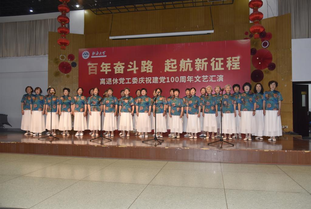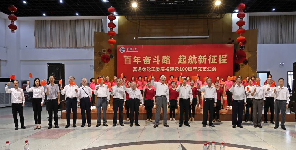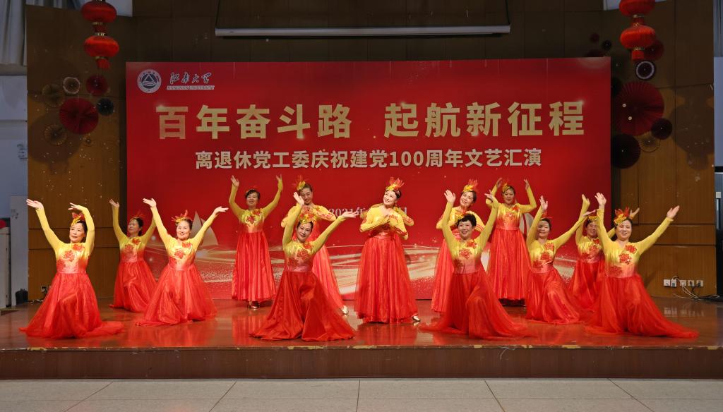 文艺汇演在老教师合唱团《祖国不会忘记》的深情歌声中拉开帷幕,紧接着陶文沂、程志翔等老领导齐声合唱《没有共产党就没有新中国》将演出带入一个小高潮,随后,离退休党工委委员、离退休工作支部党员倾情合唱了《我的祖国》。演出中,老同志们、在职人员先后表演了独唱、舞蹈、诗朗诵等共11个节目。一曲曲红歌、一幕幕真情的演出带领现场观众一同回望历史的烽烟,重温党的光辉历程,在新时代的乐章里唱响奋进新征程的赤诚与豪迈,精彩的节目一次次将演出推向高潮。最后,文艺演出在全场高唱《歌唱祖国》的嘹亮歌声中落下帷幕。