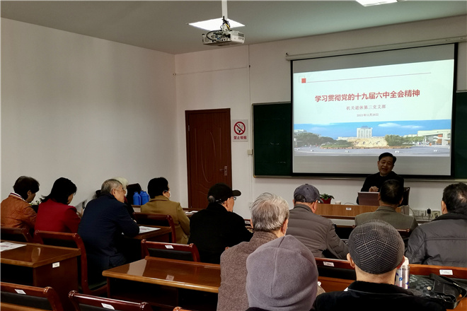11月26日,机关退休三支部组织党员认真学习了党的十九届六中全会精神,支部书记王剑星同志以“恢宏的史诗 灿烂的华章”为题,重点围绕六中全会召开的重大意义和全会公报中的重要论断和历史经验,精心制作了PPT课件,上了学习辅导党课,进行分享解读。