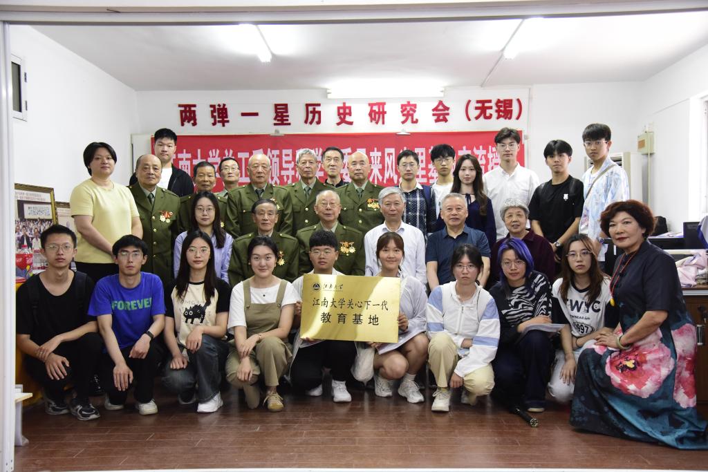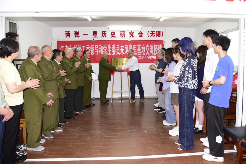 江南大学又新添一校外关心下一代基地。5月18日,校关工委与校团委在无锡市风光里青少年教育基地“两弹一星研究会”,联合举办江南大学关心下一代校外教育基地挂牌仪式。校关工委常务副主任娄国栋、校关工委副秘书长、校团委有关同志和各二级学院关工委学生委员等参加活动。两弹一星研究会主任、常务理事、江南大学校外辅导员姚炳华等教育基地的8位退役军人老同志身穿佩戴各种荣誉徽章的军装,早早来到教育基地门口,热情欢迎参加活动的江南大学师生,现场气氛热烈洋溢。