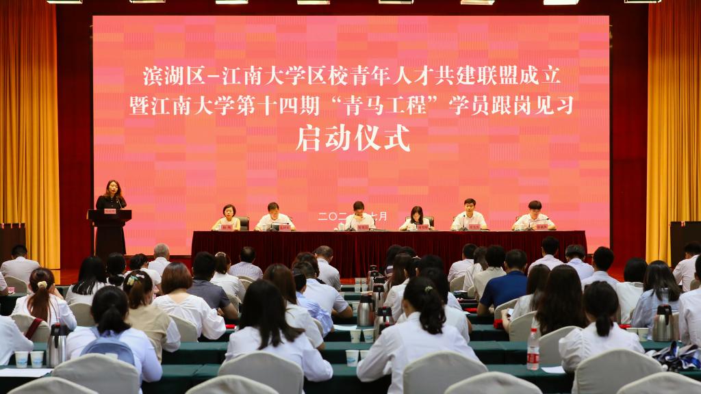 7月16日,我校与滨湖区共同举办第十四期“青马工程”学员跟岗见习启动仪式。江南大学党委组织部副部长、党校专职副校长周雪晖,校团委书记孔祥年,团委副书记杨飏,滨湖区委常委、组织部部长贾效兵,滨湖团区委书记徐光昊出席启动仪式。江南大学团委和滨湖团区委相关团干部,各跟岗见习单位分管负责同志,各镇、开发区、街道团(工)委负责同志,实践导师及调研导师代表和江南大学第十四期“青马工程”学员参加启动仪式。