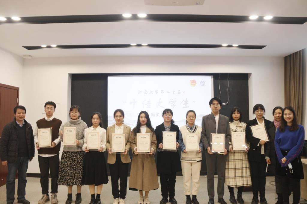 最终,法学院马晟誉、设计学院吕若煊、机械工程学院尹佳奇、物联网工程学院马睿洁、人文学院夏玉溪、外国语学院盛晓妍、人工智能与计算机学院孟辰烨、医学院徐冬妍、商学院董怡宏、理学院张源哲荣获江南大学第二十届“十佳大学生”荣誉称号。食品学院蔡劭恺、药学院王鹏威、生物工程学院潘子翯、人工智能与计算机学院柳惠、纺织科学与工程学院王婷婷获得江南大学第二十届“十佳大学生”提名奖。