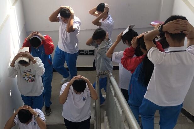 安全演练中,研支团成员首先为同学们讲解安全演练方案。当警报声响起时,全校1600余名师生迅速反应,同学们迅速蹲到课桌下,用双手和书籍护住自己的头部。随着第二声警报响起时,同学们在老师的指导下有序撤离教室,并在篮球场指定位置集合,各班班长有序清点人数并上报。本次安全演练中,江南大学研支团成员和学校老师们坚守工作岗位并规范指导学生,确保全体学生安全有序撤离和疏散。此外,学校还组织同学们在寝室再次进行地震演练,确保同学们在学校任何地点都可以迅速作出反应。