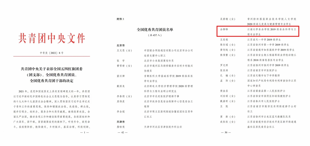2022年是中国共青团成立100周年,在五四青年节到来之际,共青团中央下发《关于表彰全国五四红旗团委(团支部)、全国优秀共青团员、全国优秀共青团干部的决定》(中青发〔2022〕8号)。江南大学食品学院2019级食品科学与工程专业本科生余柳锋荣获2021-2022年度“全国优秀共青团员”称号,这是我校继杜聪和鲁晨辉后,第三次荣获团员青年最高荣誉。