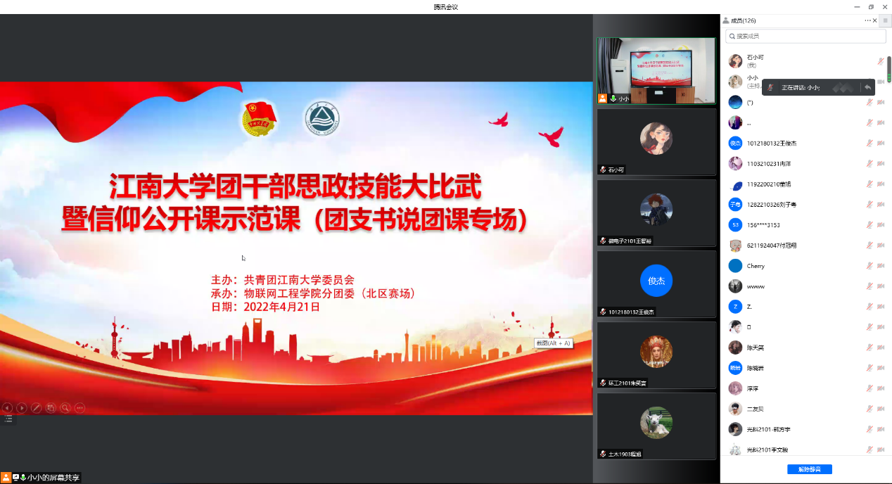 近日,为迎接党的二十大的胜利召开,进一步贯彻落实团省委部署要求,聚焦思想引领主责主业,团结引领我校团员青年坚定信念跟党走,勇做走在新时代新征程奋进者,校团委组织开展了“喜迎二十大、永远跟党走、奋进新征程”团干部思政技能大比武暨信仰公开课示范课之团支书说团课专场。为严格落实我校疫情防控相关要求,比赛分南北两个赛场同时进行。评委由校、院团委相关负责老师担任,团员代表近500人通过线上直播观摩比赛。