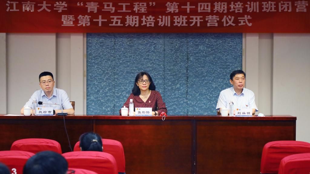 6月15日下午,江南大学第十四届青年马克思主义者培养工程闭营暨第十五届开营仪式在学校文浩馆205室举行。校党委常委、副校长张影陆,马克思主义学院院长刘焕明,校团委书记魏珍吉,全体专职团干部,第十四期、十五届“青马工程”培训班在校学员参加仪式,其余学员在线收看直播。活动由校团委副书记杨飏主持。