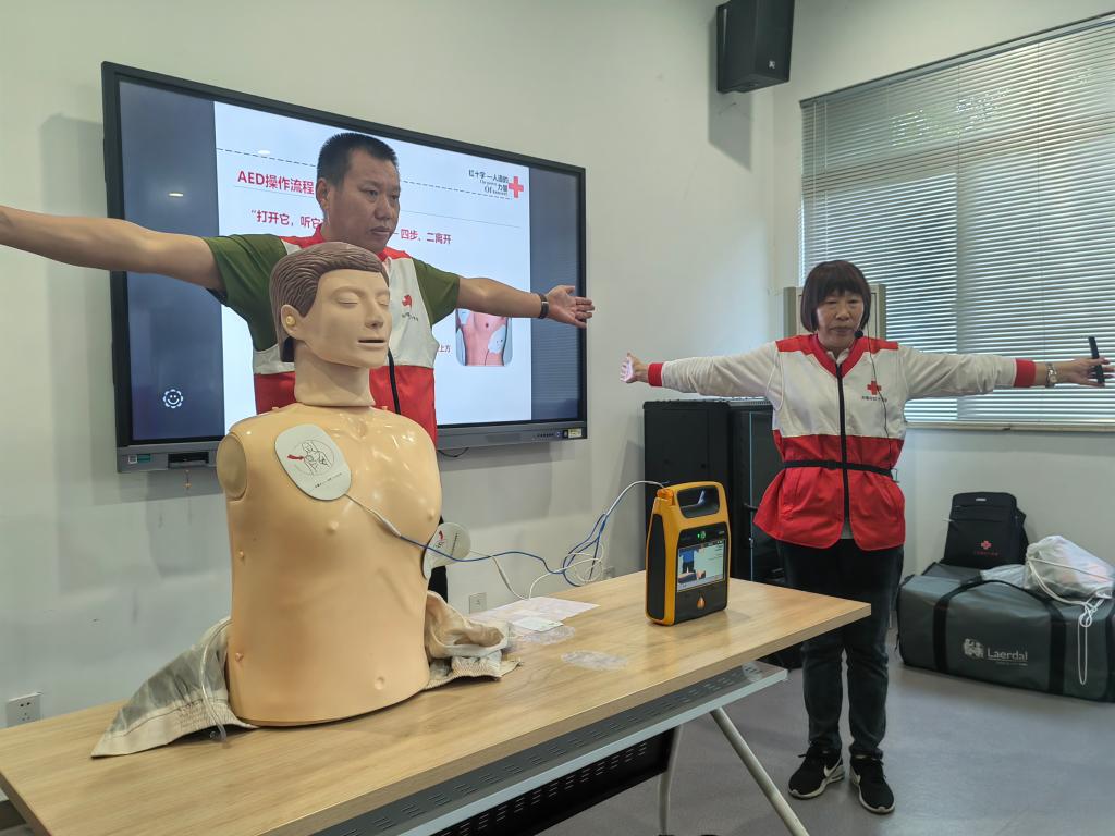 此次应急救护专题培训活动包括理论知识讲解、现场模拟演练、实践操作考核三个环节。来自无锡市红十字会的4名救护培训师,采用理论学习和操作演示相结合的教学方式,用通俗易懂、深入浅出的语言,重点对红十字运动基本知识、脑卒中等常见急症、心肺复苏(CPR)、气道异物梗阻等现场急救技能作了详细介绍,并现场演示了实施心肺复苏(AED使用)及解除气道异物梗阻的技术要领和操作步骤。