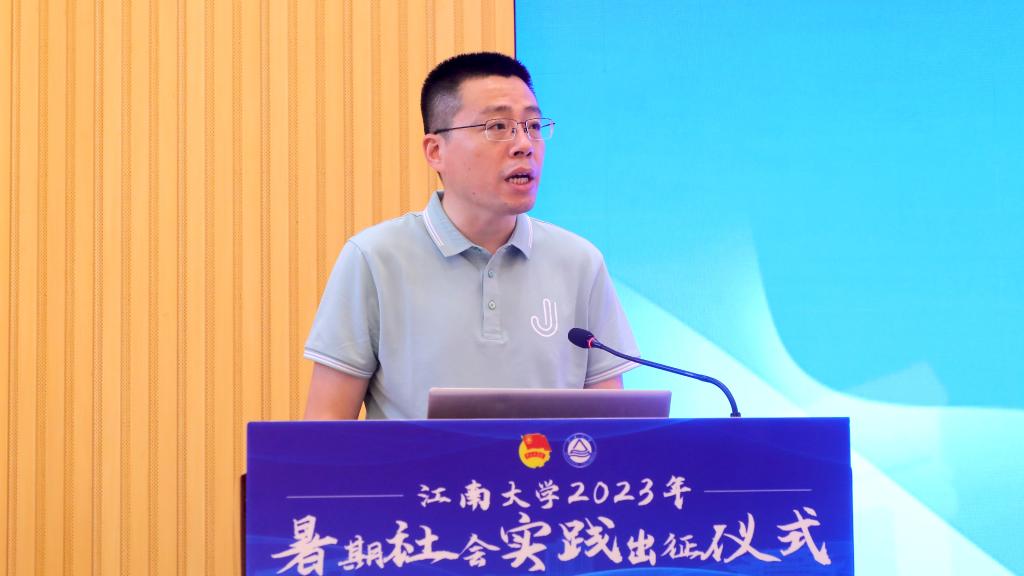 倪松涛向江南大学“强国有我,青春有为”2023年暑期社会实践团代表授旗,并作动员讲话。他围绕深学细悟笃行习近平新时代中国特色社会主义思想,强调了社会实践的重要意义,并向参与实践的同学们提出三点希望:一是以实践为本,用好调查研究这个“传家宝”;二是以实践为师,涵养“自讨苦吃”的精气神;三是以实践为舟,做好服务人民的大文章。