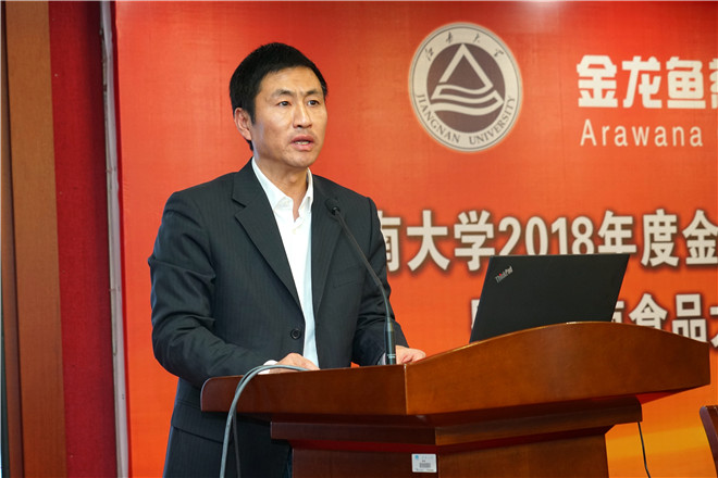 1月7日下午,江南大学2018年度金龙鱼奖学金、青年教师奖颁奖典礼暨“江南食品大讲堂”第九期主题报告会在图书馆5楼报告厅举行。益海嘉里集团研发中心总监、丰益(上海)生物技术研发中心有限公司总经理徐学兵,益海嘉里集团研发中心副总监、丰益(上海)生物技术研发中心有限公司副总经理姜元荣,益海嘉里集团研发中心资深研究员牛其文、江南大学党委副书记戴月波,社会资源处处长黄敏,学生工作处处长张菁燕,研究生院副院长武美萍,食品学院、生物工程学院、化学与材料工程学院党委副书记,以及获奖师生、学生代表等300余人参加颁奖典礼。颁奖典礼由研究生工作部副部长单筱婷主持。