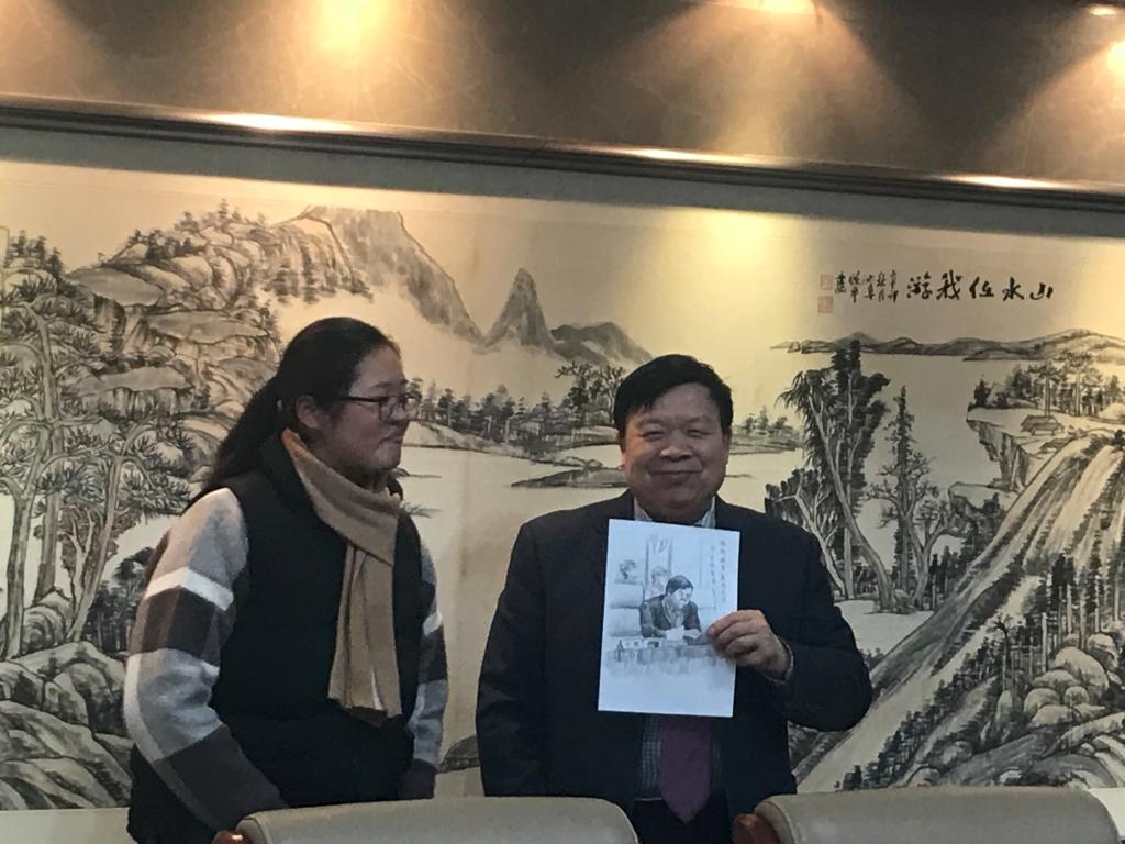 最后,2018年度德新优秀学生奖学金和德新励志奖学金的获得者设计学院学生张苑哲、王艳琼分别向陈俊德先生赠送了自己设计、创作的绘画作品以表达谢意。作品均以陈先生的工作场景为原型,一幅是俏皮可爱的卡通人像组画,一幅是现场速写素描,风格迥异,但情谊相同。