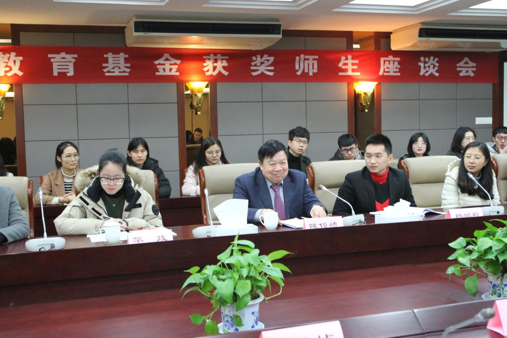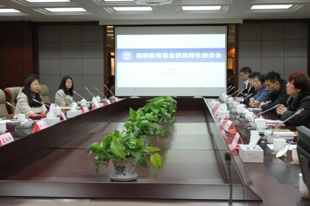3月2日,“德新教育基金”获奖师生座谈会在行政楼305会议室举行。德新钢管(中国)有限公司董事长、无锡市特钢材料有限公司总经理、江南大学优秀校友陈俊德,德新公司总经理办公室杨鹏程,江南大学老科协副会长金其桢教授、学生工作处处长张菁燕、社会资源处副处长窦新华以及历年获得德新育人奖教金、德新优秀学生奖学金和德新励志奖学金的师生代表参加了本次座谈会。座谈会由学生工作处副处长单筱婷主持。