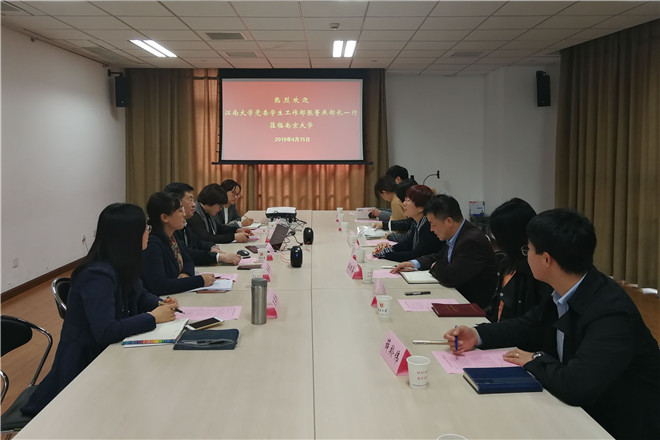 龚跃从学生思想政治教育、辅导员队伍建设、资助工作等方面介绍了南京大学学生工作部的相关情况,详细解读了以“知识的增长、能力的提升、价值的塑造、心智的健全”为宗旨的聚焦学生成长的工作理念。侍旭从精准育人的人才培养理念和五航工程的具体抓手出发,详细介绍了南京航空航天大学学生工作部在辅导员队伍建设、本科生培养、奖助育人等工作上的相关情况。张菁燕对两所学校的接待分别表示了感谢,对其先进做法表示肯定和赞赏,并希望学校之间继续加强交流,不断进步。