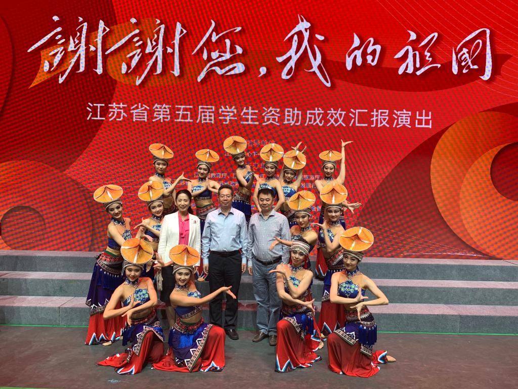 5月30日下午,“谢谢您,我的祖国——江苏省第五届学生资助成效汇报演出”在南京艺术学院实验剧场举行,江苏广电总台荔枝云平台网络同步进行全国直播。本次汇报演出由江苏省关心下一代工作委员会指导,江苏省教育厅、财政厅、民政厅、文化和旅游厅、政府扶贫工作办公室、国家开发银行江苏省分行多家单位联合主办。全国学生资助管理中心、省教育厅、民政厅、省扶贫领导小组办公室、国家开发银行江苏省分行等相关部门领导出席,全省各高校师生代表现场观看演出。我校学生资助中心与人文学院舞蹈系联合选送的女子群舞《花秧情》参加了演出。