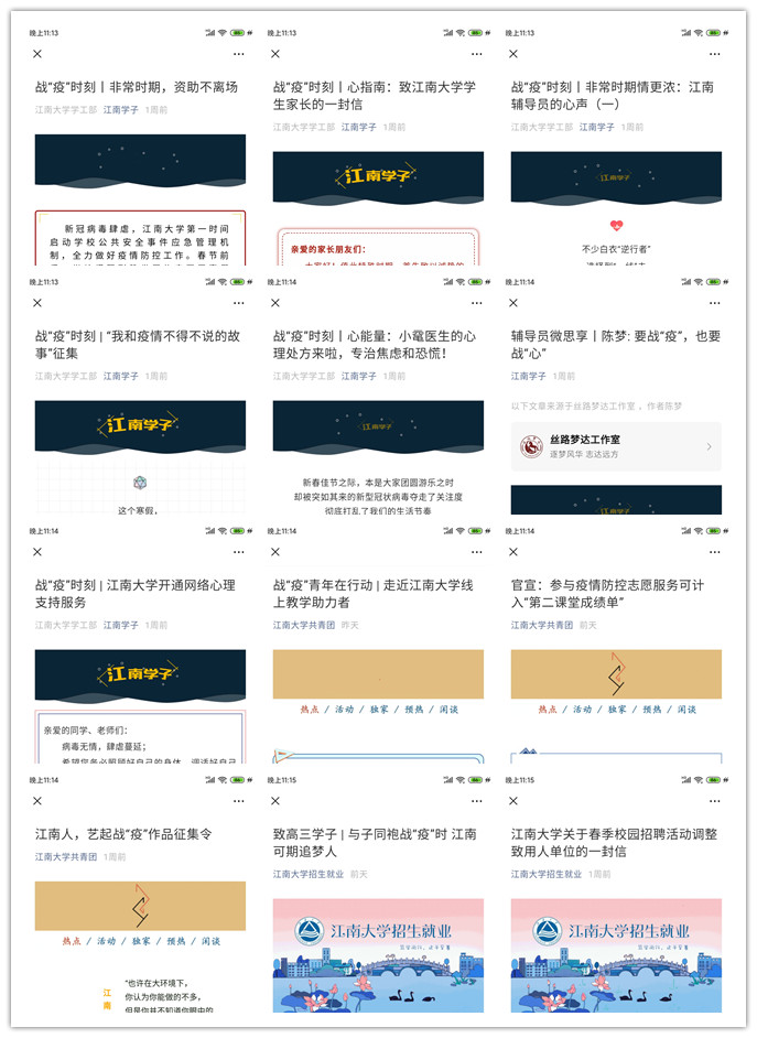 充分利用新媒体平台,开设“战‘疫’时刻”专栏,创新思政教育形式,强化师生抗击疫情的信念和信心。立足思想引领,推出“非常时期情更浓:江南辅导员的心声”、“辅导员微思享:要战‘疫’也要战‘心’”等温暖而有力量的思政文章;响应组织号召,推出“致江南大学学生家长的一封信”、“齐心协力、听从指挥,众志成城、防控疫情——江南大学学生会、研究生会致全校同学的倡议书”“导师给研究生们的一封信”等师生心声;整合学习资源,推出“@JNUers限时免费学习资源大放送”等。各学院也积极开展各具特色的活动,食品学院号召“明辨真假谣言,保持良好心态”、生物工程学院推送网文“我是江南大学生工人,我承诺!”、设计学院结合专业特色推出“心手相连,合力战‘疫’优秀作品展”等。学工系统借用“互联网+”的传播力,向全校学生发出增强疫情防控意识、倡导健康生活方式、关注自身健康、积极配合疫情防控的号召,教育学生正确认识、科学理性应对疫情。