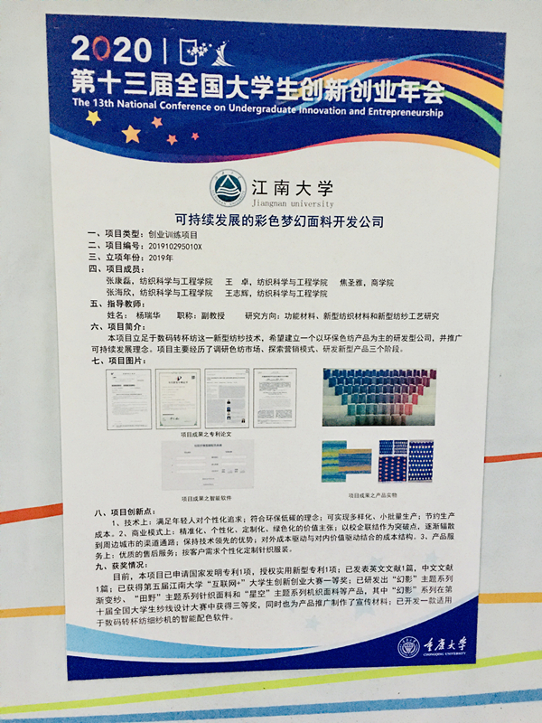 为培育优秀项目,学生工作处修订了《“大学生创新创业训练计划”项目管理办法》,强化全过程管理。同时,协同各学院积极开展校内“国创计划”项目的论文、成果遴选,并会同指导教师做好选送项目的材料准备和辅导提升工作。年会现场,我校理学院2017级光电信息科学与工程专业学生邢童璐代表年会入选论文作学术交流,纺织科学与工程学院创业训练项目《可持续发展的彩色梦幻面料开发公司》进行线上展示。