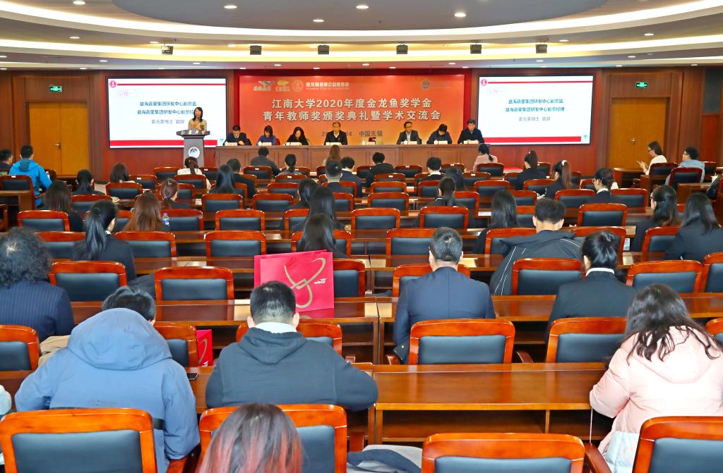 12月14日上午,江南大学2020年度金龙鱼奖学金、青年教师奖颁奖典礼暨金龙鱼学术交流年会在图书馆五楼报告厅隆重举行。益海嘉里集团研发中心副总监、益海嘉里集团研发中心副总经理姜元荣,益海嘉里家乐氏食品(上海)有限公司研发总监于娅,益海嘉里集团研发中心研究员顾杰,益海嘉里家乐氏食品(上海)有限公司研发经理李恬,江南大学副校长顾正彪,学生工作处处长张菁燕,社会资源处处长黄敏,研究生院副院长姚文生,食品学院、生物工程学院、化学与材料工程学院党委副书记,以及获奖师生代表等近200人参加颁奖典礼。典礼由食品学院党委副书记魏珍吉主持。