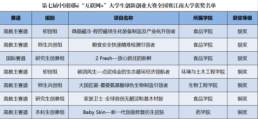 10月12日至15日,第七届中国国际“互联网+”大学生创新创业大赛全国总决赛现场比赛在南昌大学举行。江南大学共有7支参赛团队入围全国总决赛,经过激烈的角逐,分别获银奖3项,铜奖4项。同期,化学与材料工程学院创业校友杨禄获第三届“创新创业英才奖”(全国仅10人)。