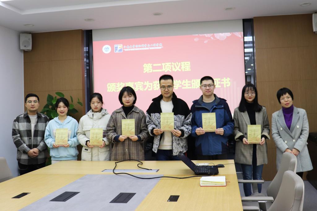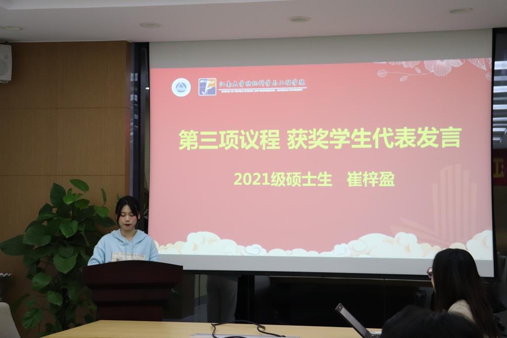 出席领导老师首先为获奖师生代表发放获奖证书并合影留念。随后,获奖学生代表崔梓盈、孙嘉琦发言,她们代表全体获奖学生对桑麻教育基金会以及关心帮助其成长的学院领导老师表示衷心感谢,结合自己在江南大学的学习、竞赛经历,分享了自己的求学经历。号召同学们在今后的学习、科研和生活中,以更高的标准要求自己,以实际行动回报学院和桑麻基金会的殷切期望。