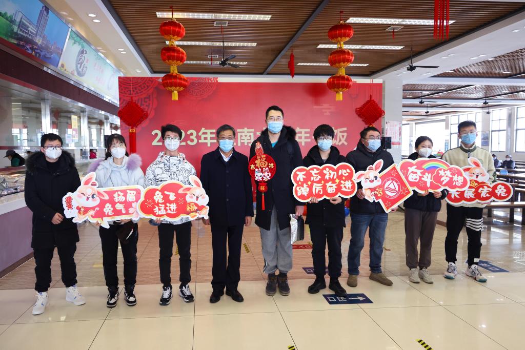 一片喜庆祥和的气氛中,校领导们与留校学生们亲切交流,畅聊各地春节习俗,畅叙明日未来期盼。他们细细叮嘱同学们要多参加体育锻炼和集体活动、加强身心健康管理、多与家人朋友沟通交流;亲切勉励同学们要珍惜大好时光,少年辛苦终身事,莫向光阴惰寸功;督促学校要为留校师生做好后勤保障和人文关怀,保证留校师生在学校同样也能感受到年味、感受到温情。欢声笑语中,大家高举学校特别定制的印有“大展宏‘兔’”“‘兔’飞猛进”“征途漫漫惟有奋斗”等新年祝福语的手牌合影留念。