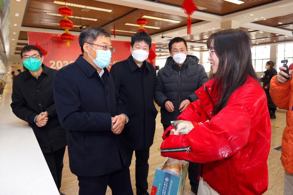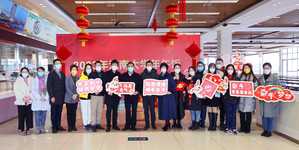 玉兔踏春来,万物生光辉。1月21日除夕当天,一食堂江南苑二楼张灯结彩,洋溢着浓浓的年味。学校为离家万里的留校学子们准备了除夕团圆午宴活动,一同喜迎新春。留校学生凭借卡券于除夕当天领取内含荤素搭配、营养丰富的美味菜肴以及可口甜点的除夕套餐。校长陈卫,党委副书记戴月波,校党委常委、副校长倪松涛,携校办、宣传部、学工处、保卫、后勤等部门负责人来到食堂,看望慰问留校学生及工作人员。陈卫亲自将除夕套餐一一递到学生手中,并代表学校向留校师生们致以新春祝福。他说:“刚刚过去的2022年,是令人难忘、当歌当书的一年。我们耕耘梦想、共克时艰、创先晋位、连创佳绩,共同用“大爱”书写了学校奋力向前的模样,这一年大家都辛苦了!新年岁首,又是一年的开头,又是一个新的希望的开端,在逐梦路上,我们每一位江南人都是星光下的赶路人。今天,我们一家人相聚在这里,感受温馨和谐、欢乐祥和的节日氛围。学校始终记挂着你们、惦念着你们,希望来自学校大家庭的爱和温暖,能够陪伴你们过一个有温度、有情怀、有意义的幸福年。”