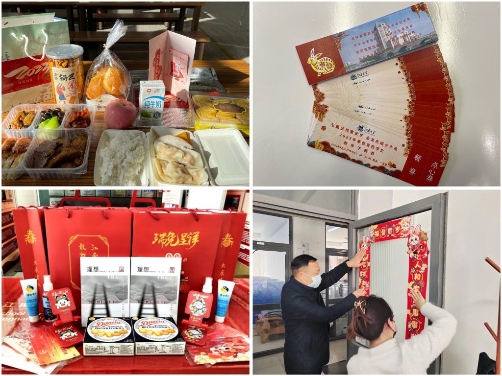 卯兔贺岁,迎春纳福。在这个万家灯火、阖家欢乐的节日里,学校更加关心那些家庭经济困难的学生群体。临近春节之际,学校提前为每一位寒假留校学生发放了200元新春红包,另外还为其中贫困学生增发了800元、500元、300元不等的新春慰问金。为保障学生留校期间疫情防控生活需求,学校还准备了健康大礼包。此外,寒假期间,学校持续开展临时困难救助工作,为学生们的正常生活提供物资帮扶;开通24小时的心理健康专线和校园各项问题处理的专线,第一时间做好心理关怀和情绪疏导。同时,坚持“以生为本”,党办、校办、学工、后勤等相关部门寒假期间安排人员每日到校值班,密切配合,预防并及时处理留校学生各类紧急事件,全力保障寒假留校学生住得安心、吃得放心、学得用心,为温暖行动护航,助力无忧过大年。