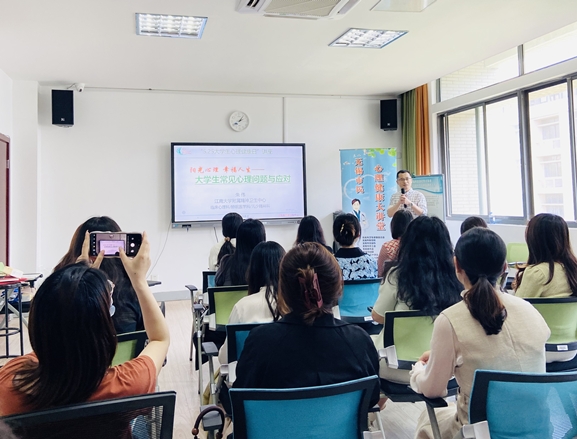 无锡市精神卫生中心主任医师朱伟开展题为《阳光心理幸福人生——大学生常见心理问题与应对》的讲座,为大家呈现心理健康的现状、识别、干预和治疗。讲座还通过无锡教育电视台同步直播,累计观看超过5000人次。随后,注册音乐治疗师张一楠、曾安羚面向我校专兼职咨询师、感兴趣的辅导员和其他教师开展音乐治疗团体体验,在鼓圈的节奏、轮流的带领和冥想的放松中释放自我。