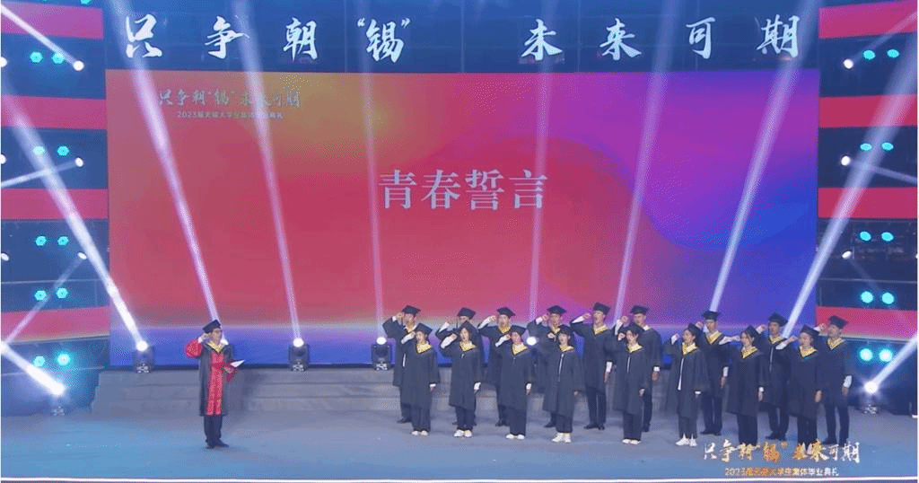 5月26日晚,“只争朝‘锡’未来可期”2023届无锡大学生集体毕业典礼在无锡学院举行。江南大学党委常委、副校长倪松涛出席活动。博士生费良作为“十佳优秀毕业生”在“青春宣誓”环节进行领誓。