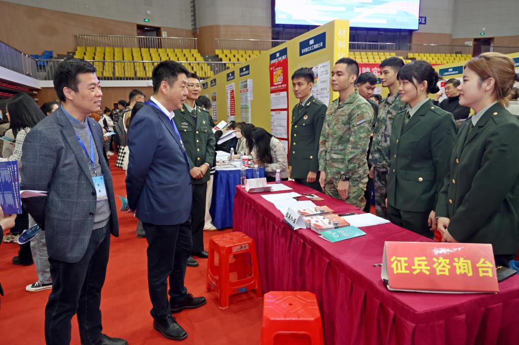 本次征兵宣讲会承袭往年做法,在校毕业生大型招聘会上设置展位,抓住毕业生人数众多的契机,拓展宣传渠道,更高效便捷地开展政策宣讲。活动现场气氛热烈,征兵宣传人员通过悬挂横幅、设置咨询台、摆放展板、发放征兵宣传资料、现场咨询、现场加群等方式,向有入伍意向同学细致讲解今年的征兵政策条件、报名方法及相关优待政策,深入宣传依法服兵役的积极意义,鼓励即将毕业的同学积极报名应征,报效祖国。期间也吸引了部分研究生现场咨询了解。