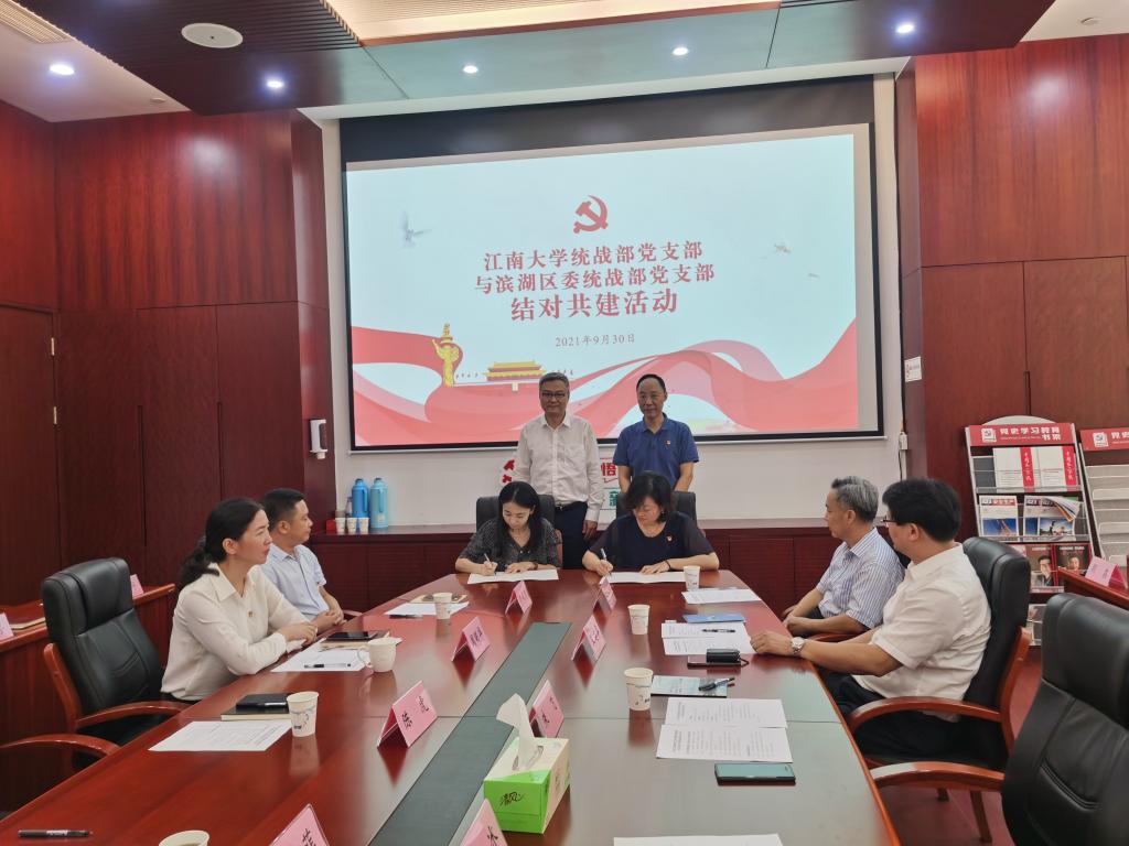 近日,江南大学党委办公室、党委统战部、保密办公室党支部与滨湖区委统战部党支部进行结对共建,结成“友好党支部”。江南大学党委常委、统战部部长朱飞,滨湖区委常委、统战部部长陈虎出席活动。