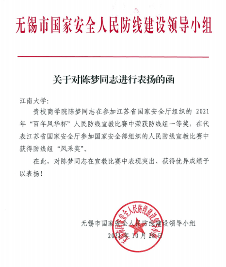 近日,无锡市国家安全人民防线建设领导小组对我校商学院辅导员陈梦老师发函表扬。陈梦代表江苏省国家安全厅在参加国家安全部组织的人民防线宣教比赛中表现突出,喜获防线组“风采奖”,为省、市、校争得荣誉。