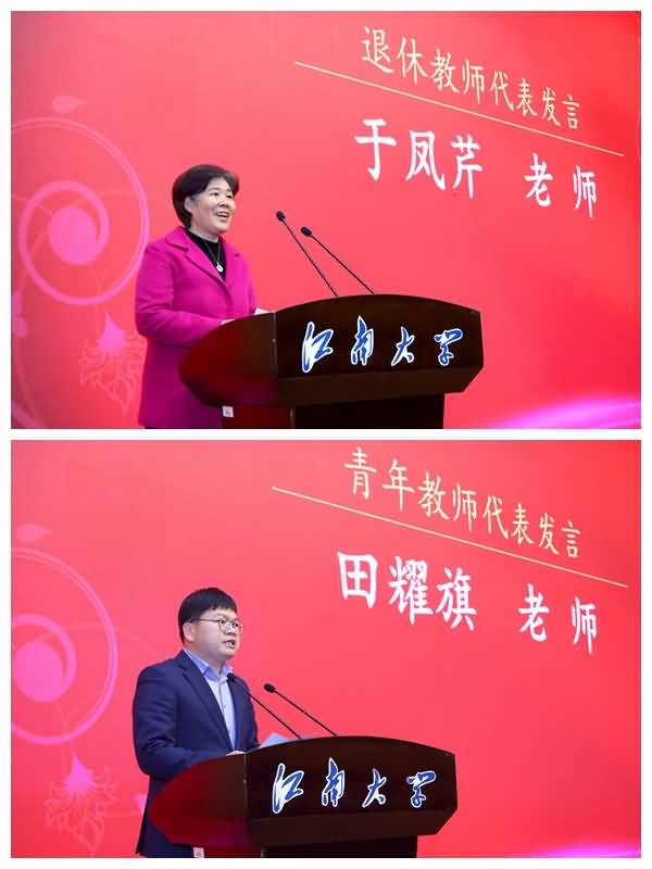 物联网工程学院于凤芹老师代表荣休教师发言,她分别用“感谢”“成长”“祝福”三个词,分享了自己在校期间的成长历程,表达了对学校支持、培养的感激之情以及对学校未来发展的美好祝福。食品学院田耀旗老师代表青年教师发言,他表示,将努力传承老一辈的优良作风、精神财富和宝贵经验,以学校“奋进计划”为引领,以“双一流”建设发展为己任,不断进取,追求卓越,为学校发展创造新的辉煌。