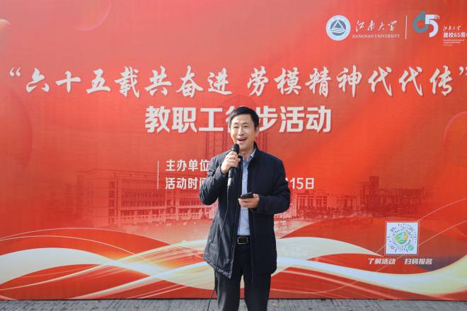 为庆祝江南大学建校65周年,宣传劳模精神,丰富广大教职工业余文化生活,增强团队凝聚力,提高教职工身体素质,展示我校教职工风采,11月15日,校工会组织开展“六十五载共奋进 劳模精神代代传”教职工主题徒步活动,校党委副书记戴月波,校党委常委、统战部部长、校工会主席朱飞,各学院及机关各部门干部、教职工约1500人参加了本次徒步活动。