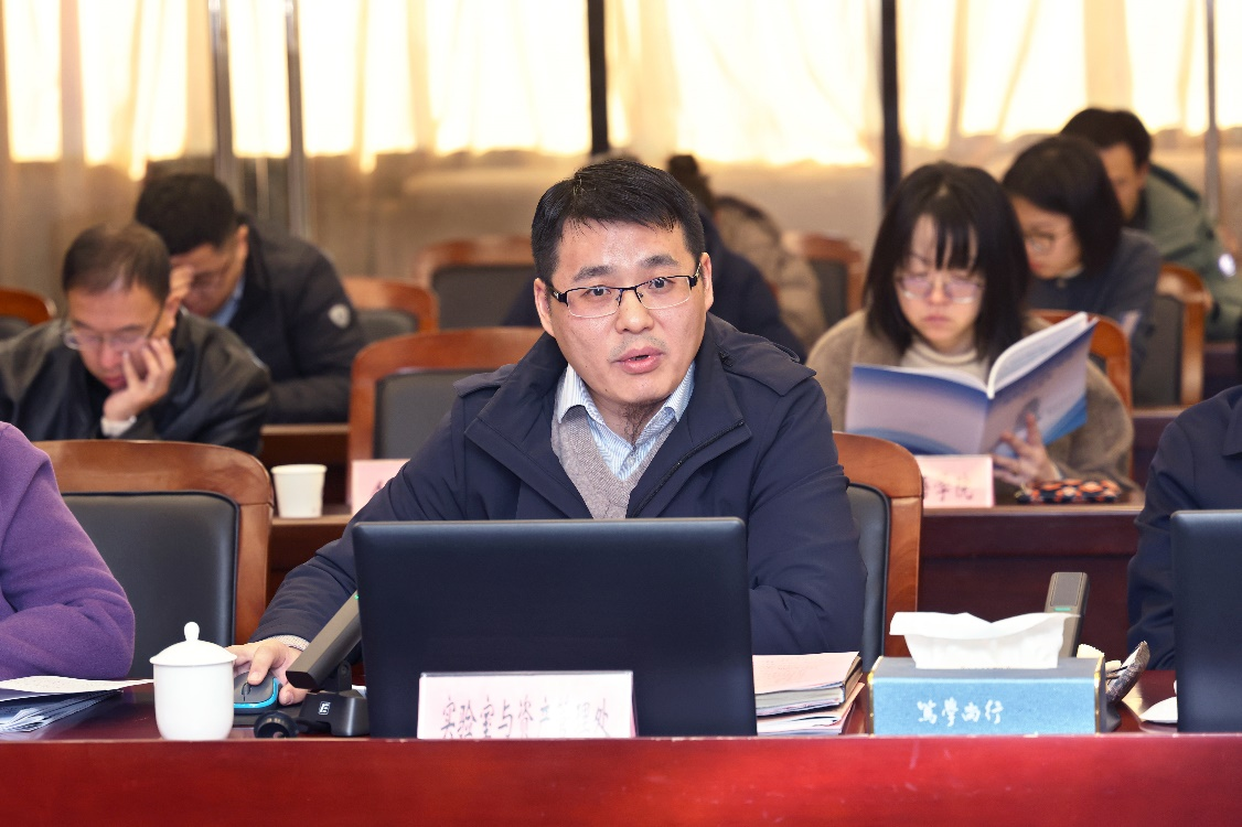 首先,实验室与资产管理处处长蔡以兵代表实验室建设与安全工作委员会作2024年度工作汇报。他围绕实验室建设、安全管理、大型仪器设备管理以及设备保障4个方面开展的工作进行了详细汇报,并对2025年拟开展重点工作进行部署。