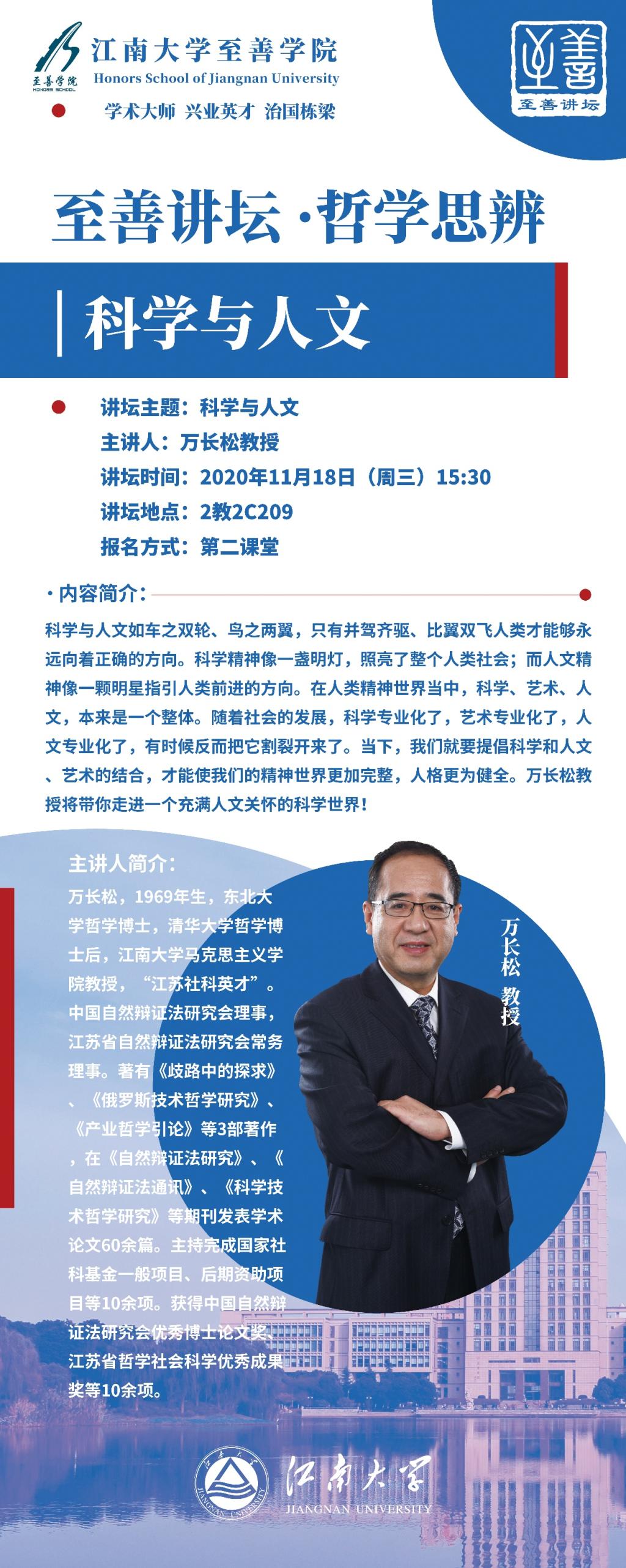 科学与人文如车之双轮、鸟之两翼,只有并驾齐驱、比翼双飞人类才能够永远向着正确的方向。科学精神像一盏明灯,照亮了整个人类社会;而人文精神像一颗明星指引人类前进的方向。在人类精神世界当中,科学、艺术、人文,本来是一个整体。随着社会的发展,科学专业化了,艺术专业化了,人文专业化了,有时候反而把它割裂开来了。当下,我们就要提倡科学和人文、艺术的结合,才能使我们的精神世界更加完整,人格更为健全。万长松教授将带你走进一个充满人文关怀的科学世界!