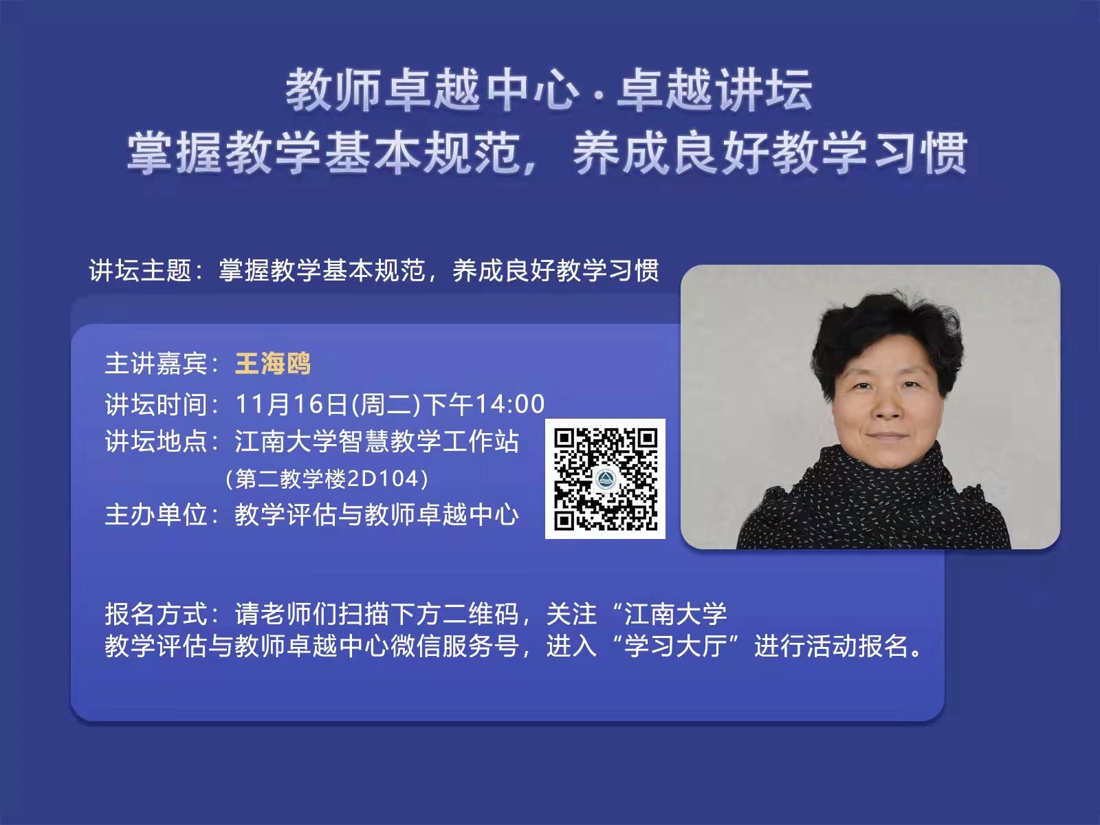 报名方式:请老师们扫描下方二维码,关注“江南大学教学评估与教师卓越中心”微信服务号,进入“学习大厅”进行活动报名。
